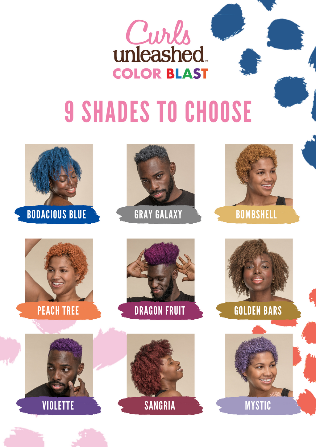Curls Unleashed Color Blast provides a temporary color solution, formulated with moisturizing beeswax, to elongate and define curls with beautiful, vivid colors and no damage.