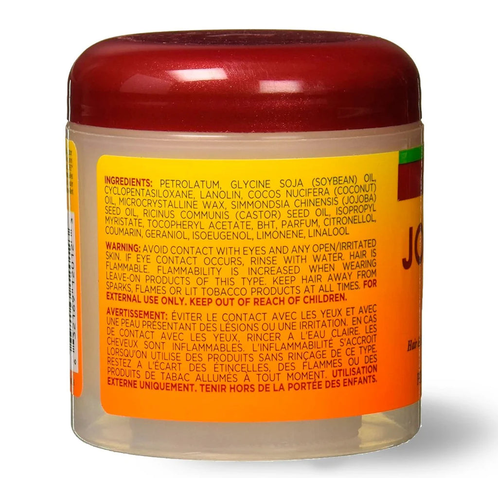 Jojoba Oil: A powerful antioxidant rich in fatty acid and Omega-9. Moisturizes and conditions for softness and added shine.